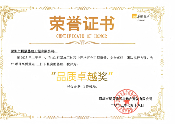 羅湖湖貝A2樁基礎(chǔ)工程榮獲“品質(zhì)卓越獎”、“進度先進個人”及“資料綜合先進個人”